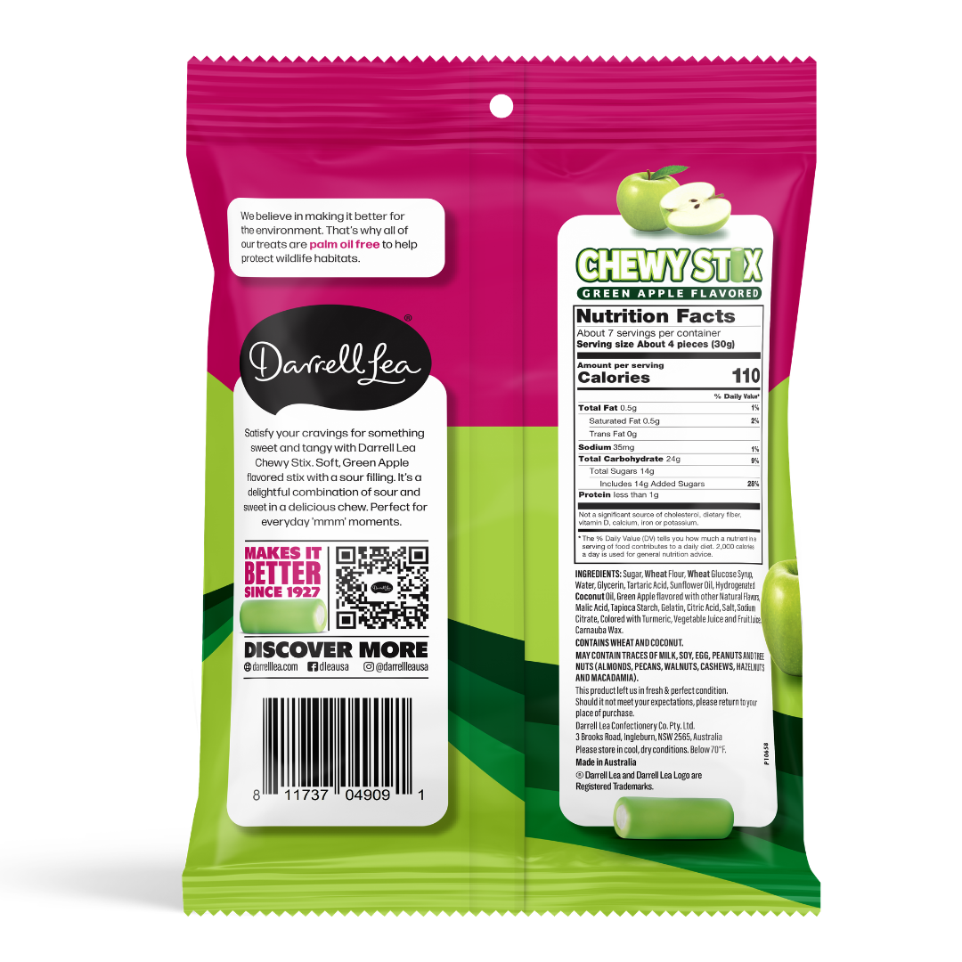 Satisfy your cravings for something sweet and tangy with Darrell Lea Green Apple Chewy Stix. Soft green apple flavored stix with a sour filling. It’s a delightful combination of sour and sweet in a delicious chew. Perfect for everyday ‘mmm’ moments.