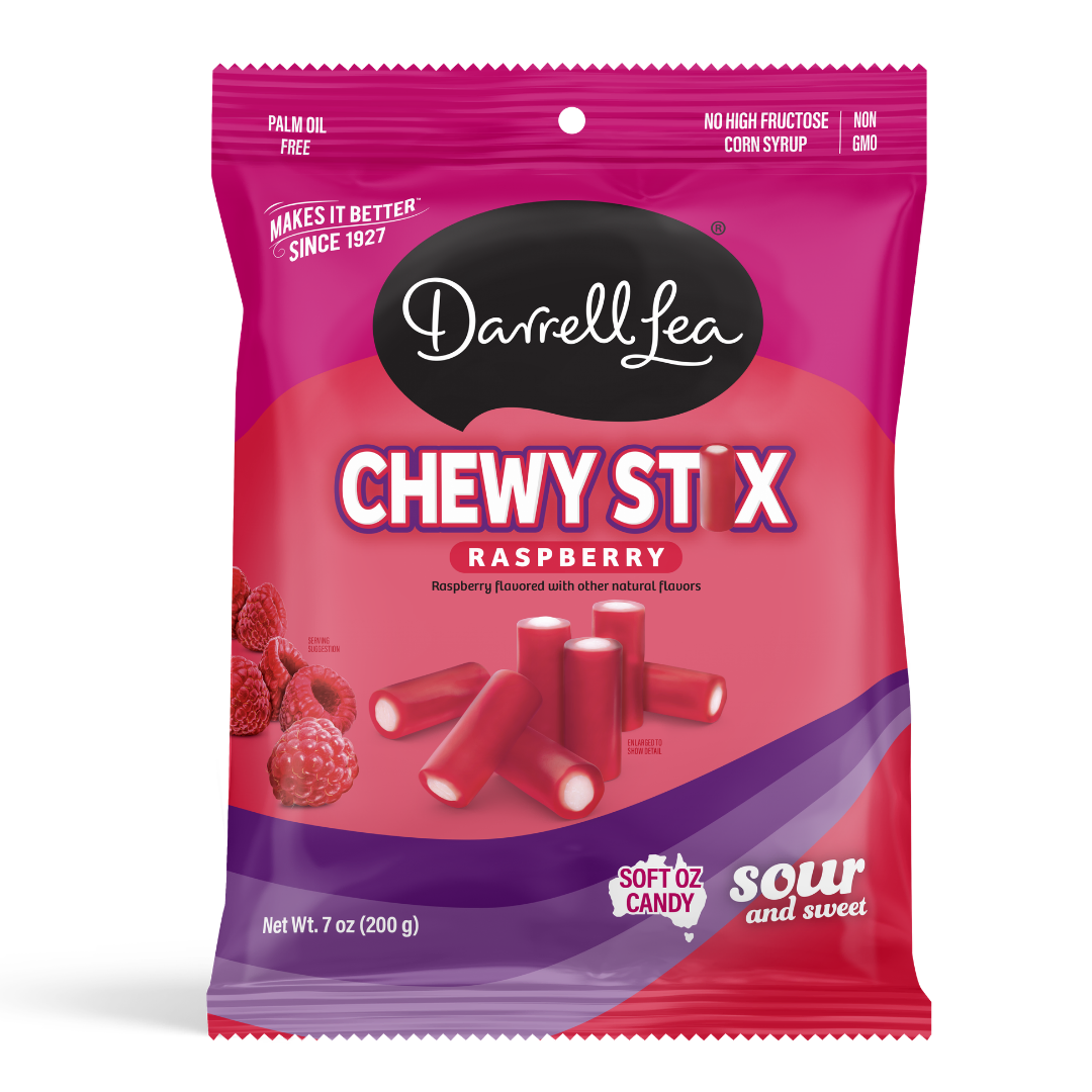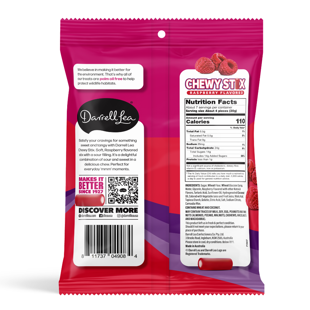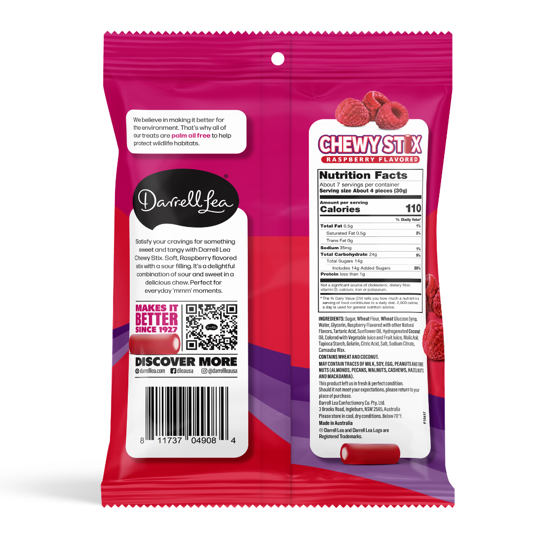 Satisfy your cravings for something sweet and tangy with Darrell Lea Chewy Stix. Soft Raspberry flavored stix with a sour filling. It’s a delightful combination of sour and sweet in a delicious chew. Perfect for everyday ‘mmm’ moments.
