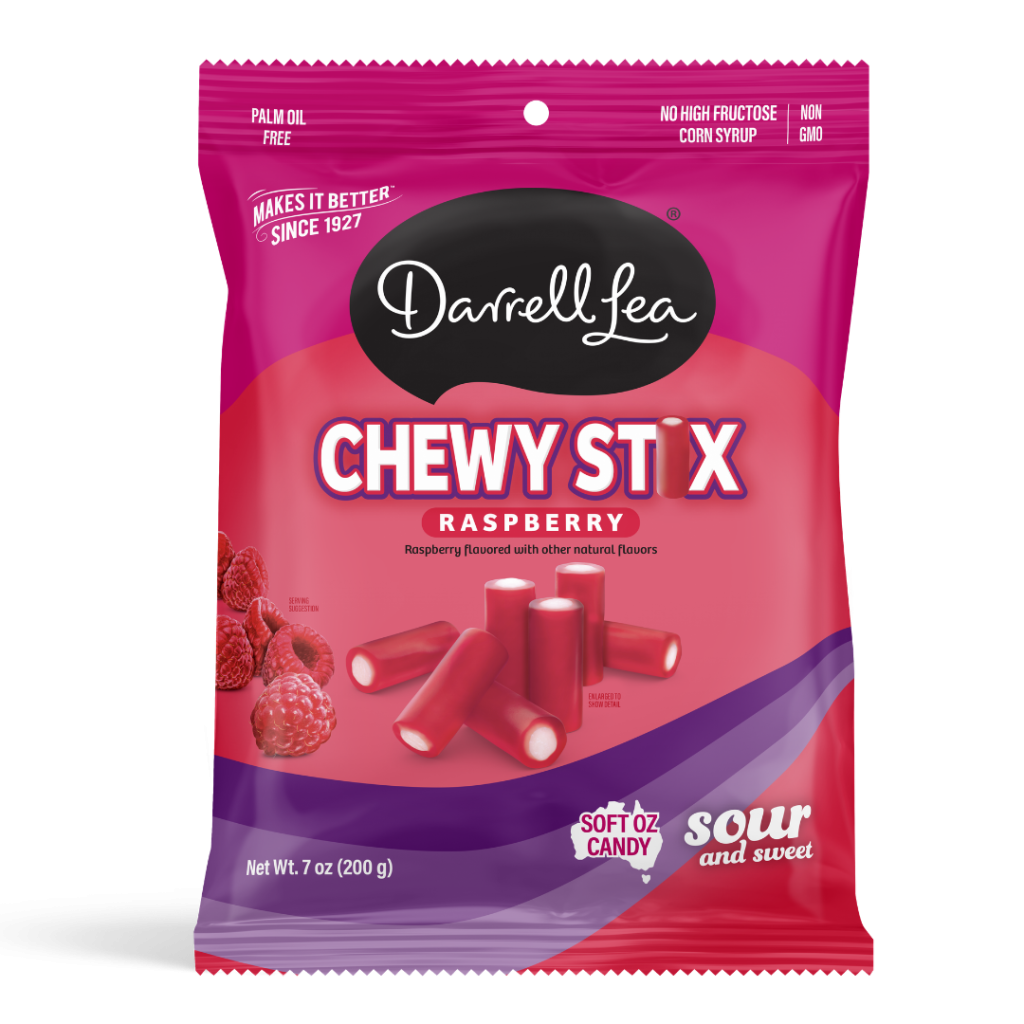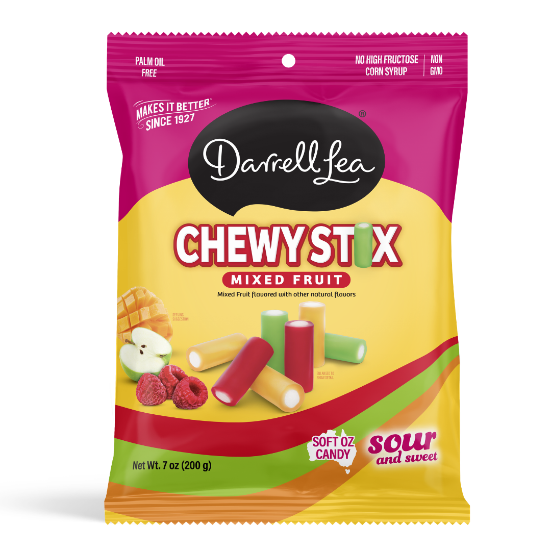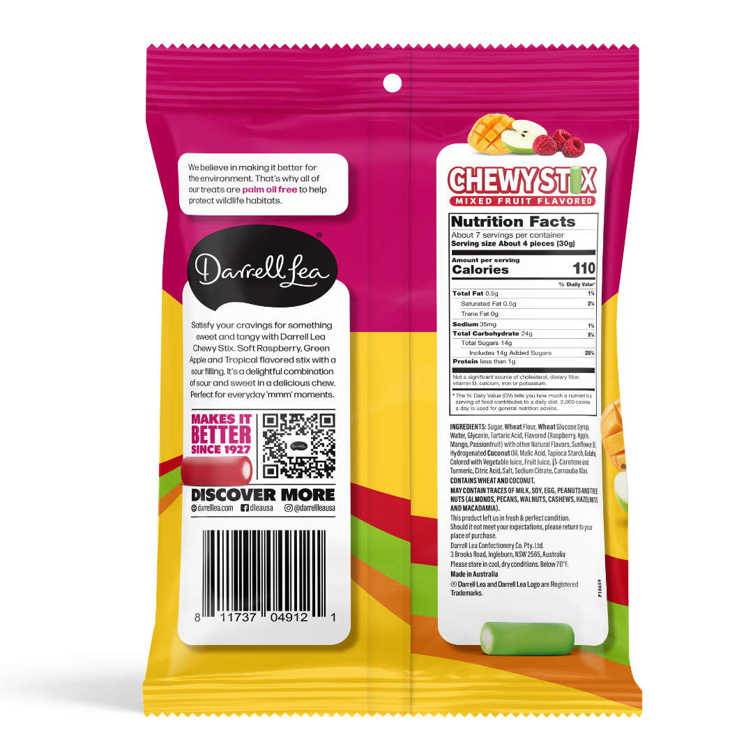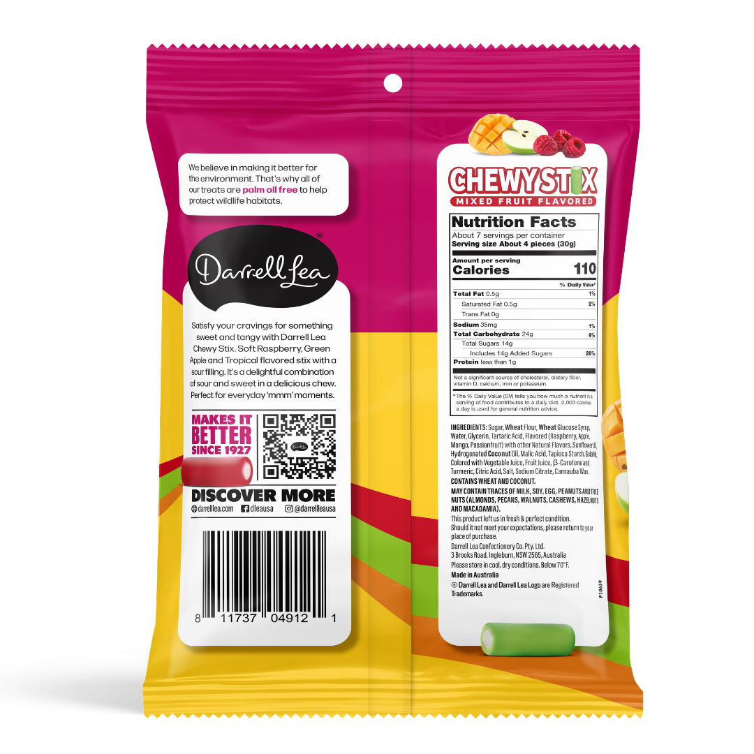Satisfy your cravings for something sweet and tangy with Darrell Lea Chewy Stix. Soft and chewy raspberry, green apple and tropical flavored stix with a sour filling-guaranteed to make your tastebuds tingle! It’s a delightful combination of sour and sweet in a delicious chew. Perfect for everyday ‘mmm’ moments.