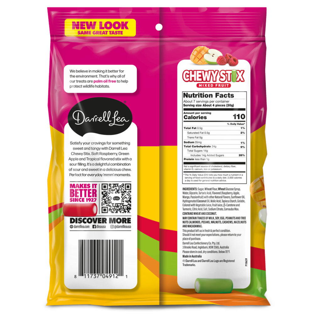 Satisfy your cravings for something sweet and tangy with Darrell Lea Chewy Stix.  Soft and chewy raspberry, green apple and tropical flavored stix with a sour filling-guaranteed to make your tastebuds tingle! It’s a delightful combination of sour and sweet in a delicious chew. Perfect for everyday ‘mmm’ moments.
