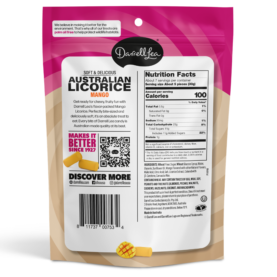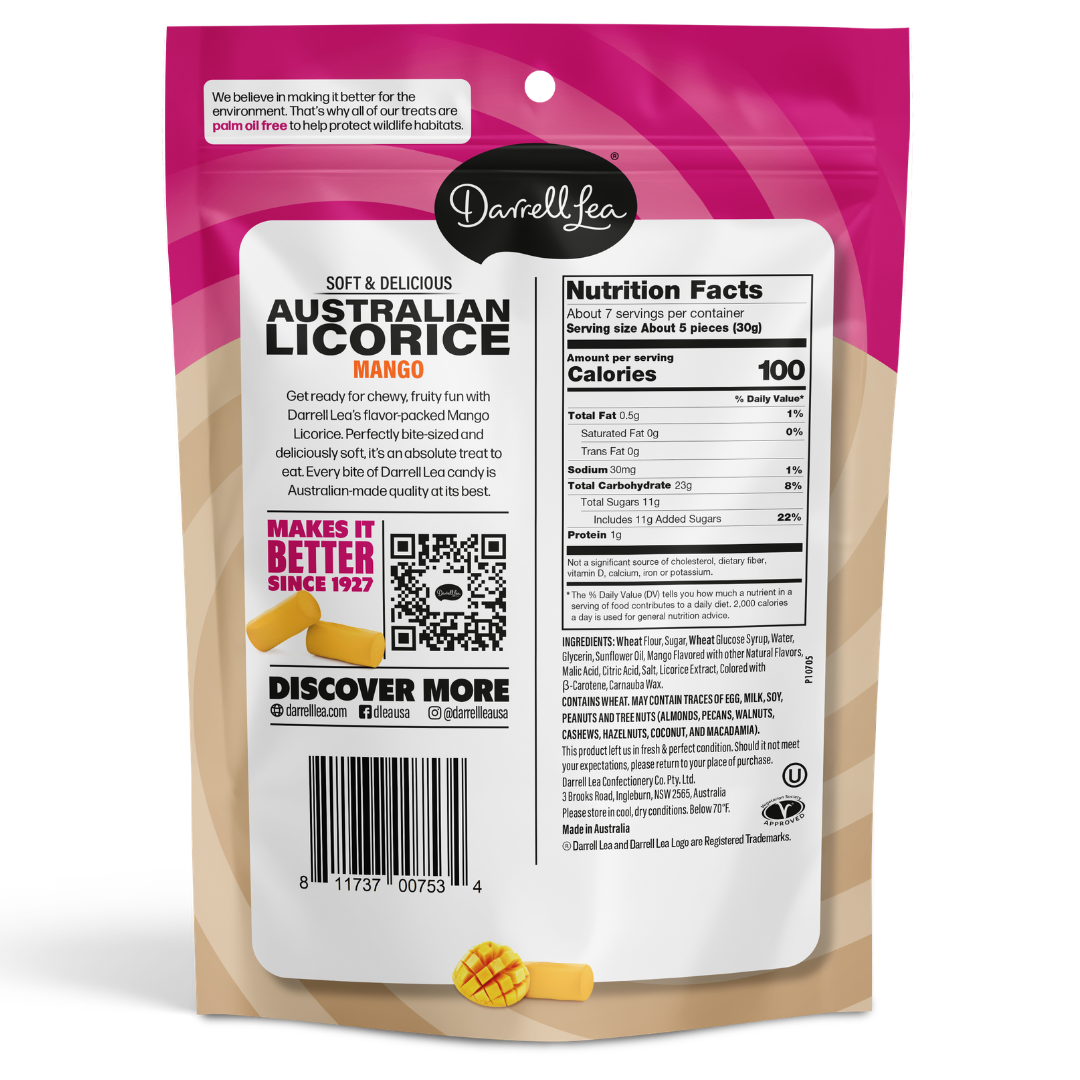 If there’s one thing Darrell Lea knows, it’s licorice. Taste it in our 100% Aussie made soft licorice. It’s full of exotic, delicious mango flavor.