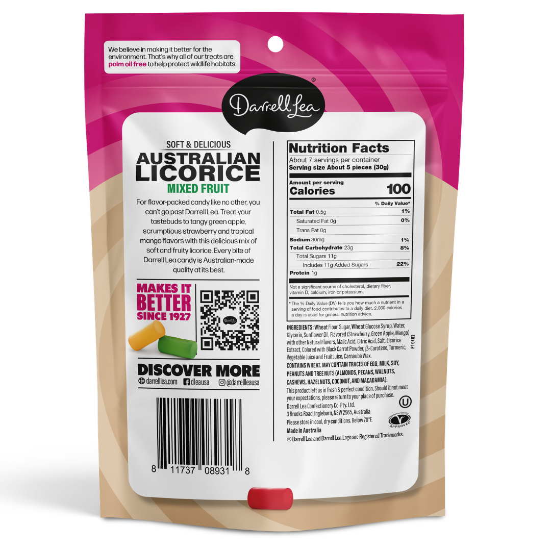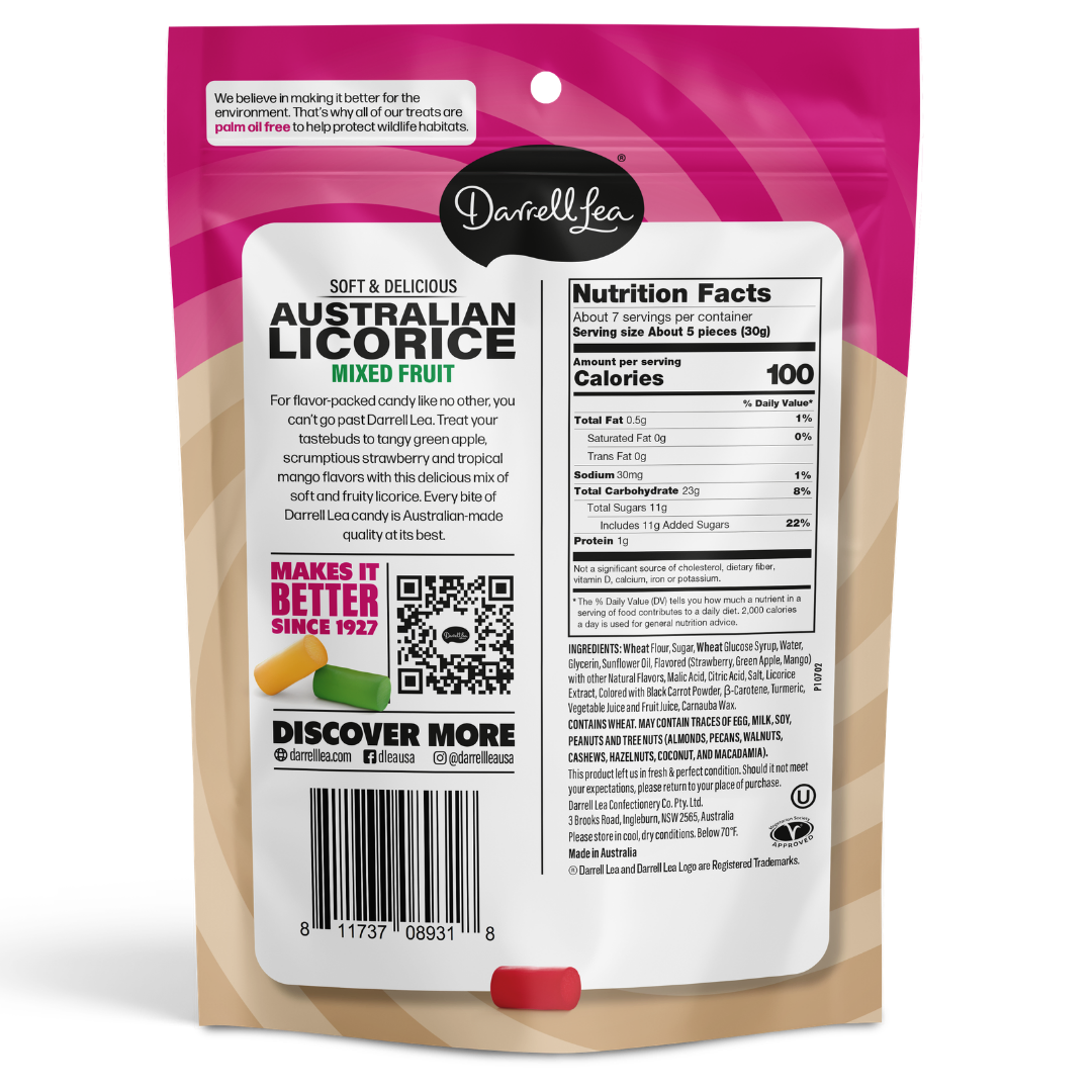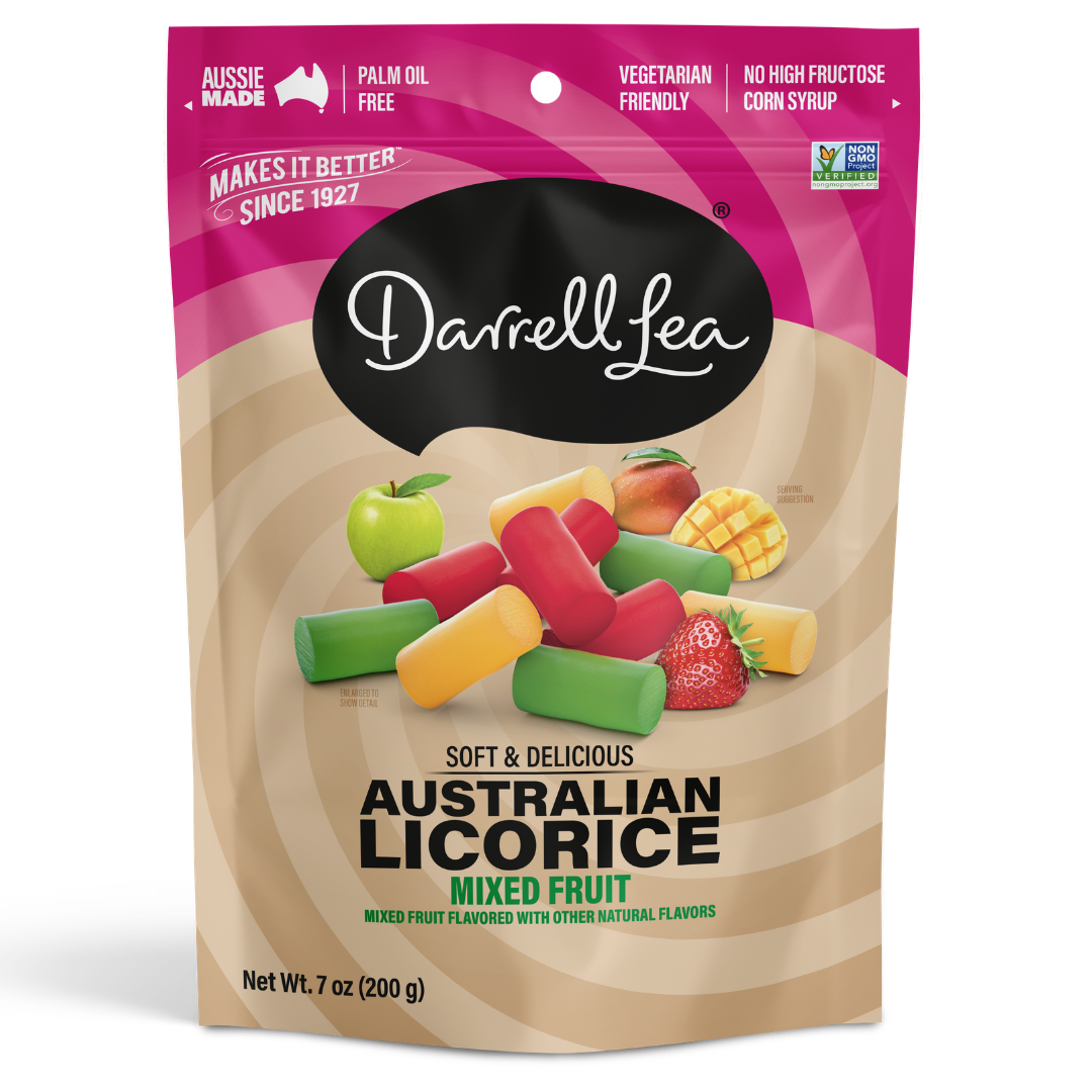 If there’s one thing Darrell Lea knows, it’s licorice. Taste it in our 100% Aussie made, soft licorice. It’s full of delicious strawberry, mango and green apple flavor offering a combination of irresistible taste and texture.