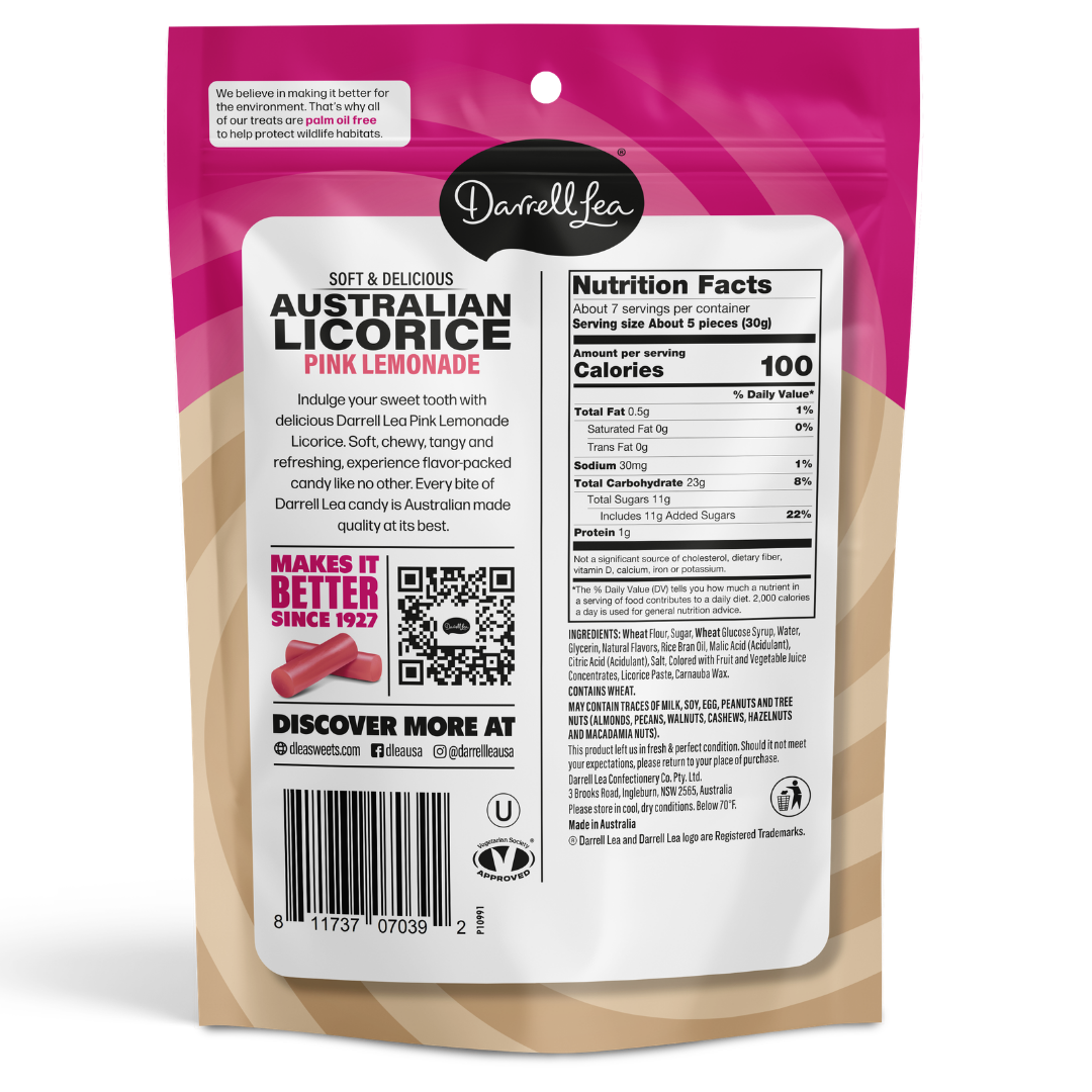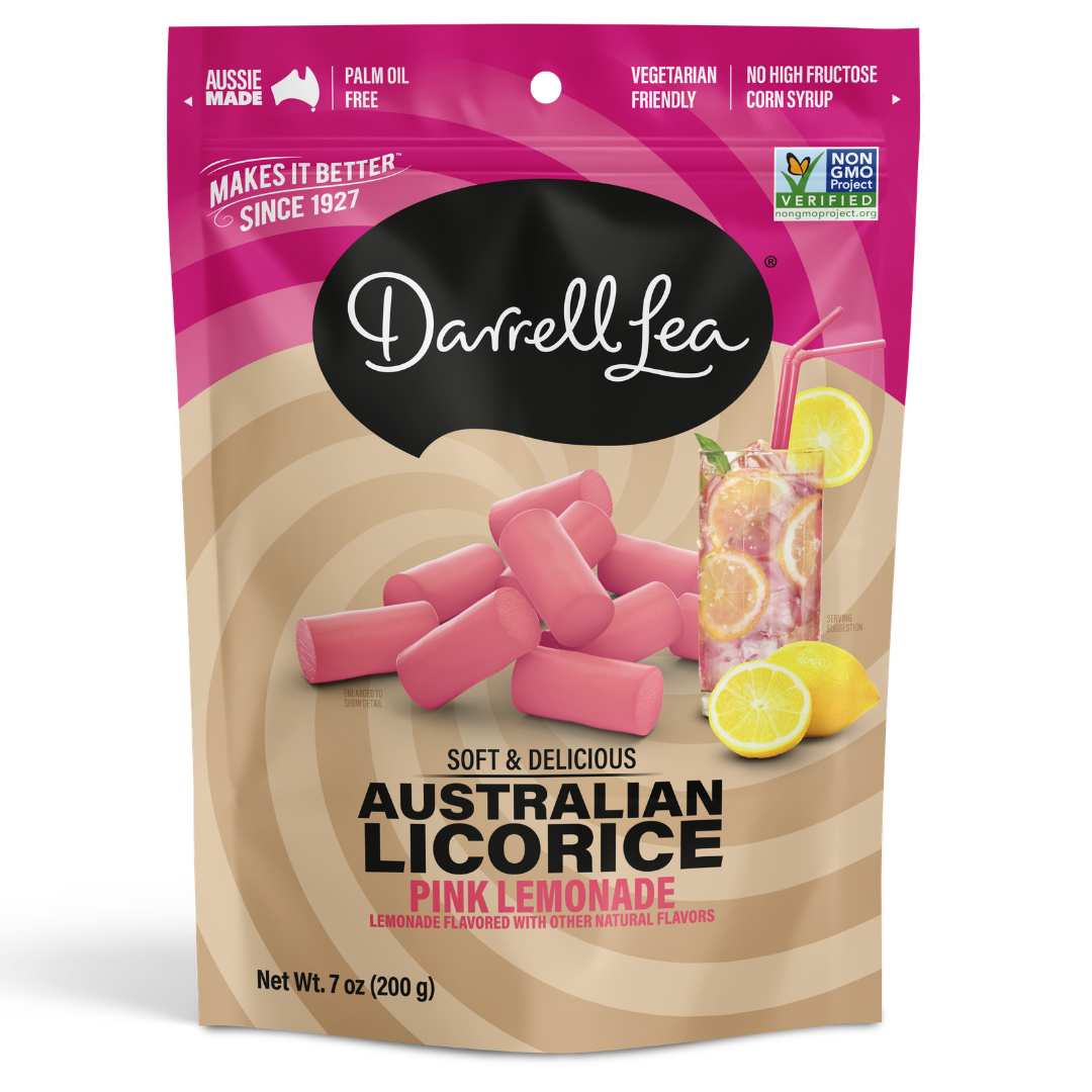 Indulge your sweet tooth with delicious Darrell Lea Pink Lemonade Licorice. Soft, chewy, tangy and refreshing, experience flavor-packed candy like no other. Every bite of Darrell Lea candy is Australian made quality at its best.