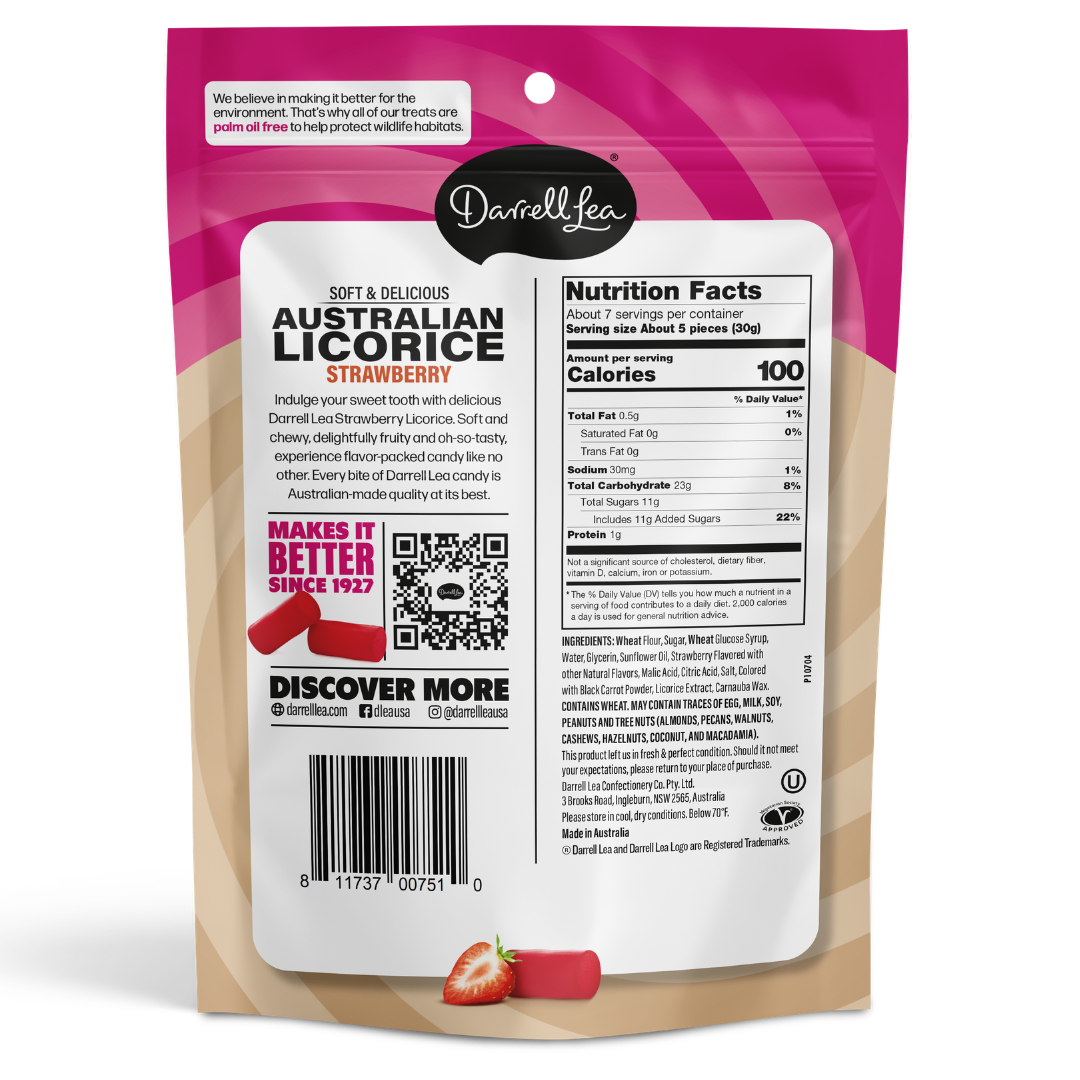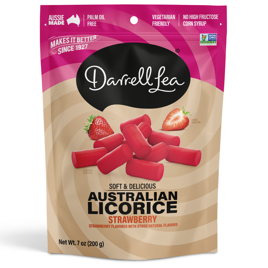 If there’s one thing Darrell Lea knows, it’s licorice. Taste it in our 100% Aussie made, soft licorice. It’s full of bright, delicious strawberry flavor, offering a combination of irresistible taste and texture.
